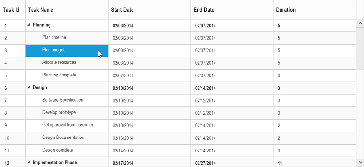 </ej:TreeGrid>The output of the TreeGrid with hierarchy selection enabled.