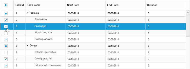 </ej:TreeGrid>The output of the TreeGrid with checkbox enabled in task name column.