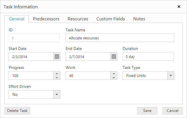 Gantt add and edit dialogs groups the data sources fields in five different tabs such as General, Predecessors, Resources, Custom Fields and Notes.