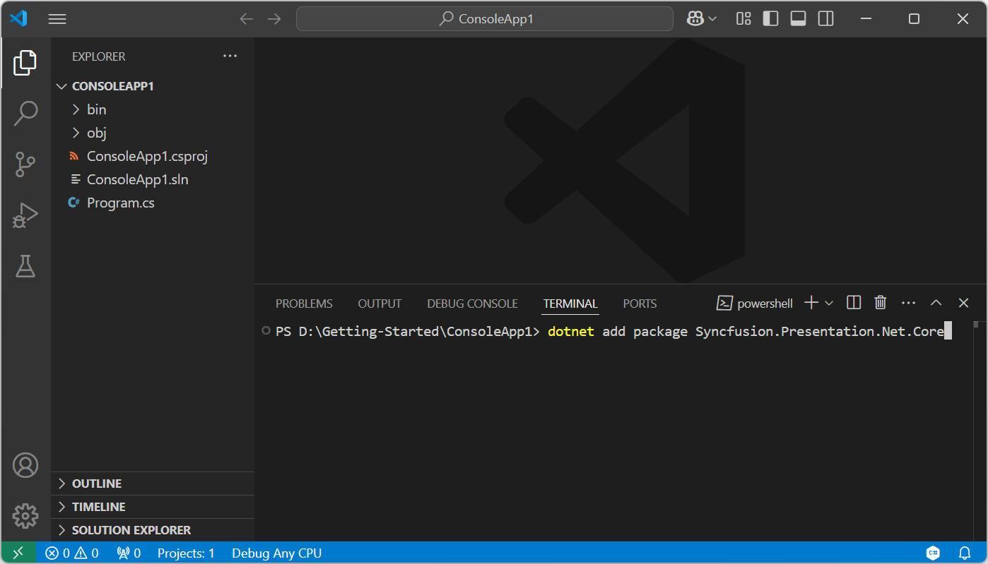 dotnet add package Syncfusion.Presentation.NET.Coreto install the NuGet package.