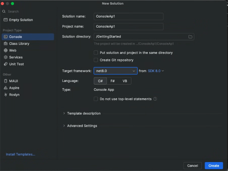 - Choose the Console App template.