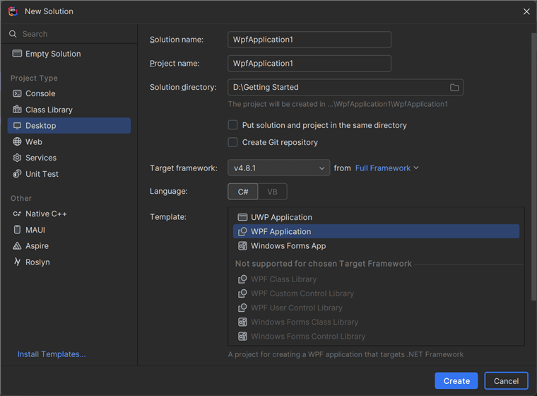 Step 1. Open JetBrains Rider and create a new WPF application project.