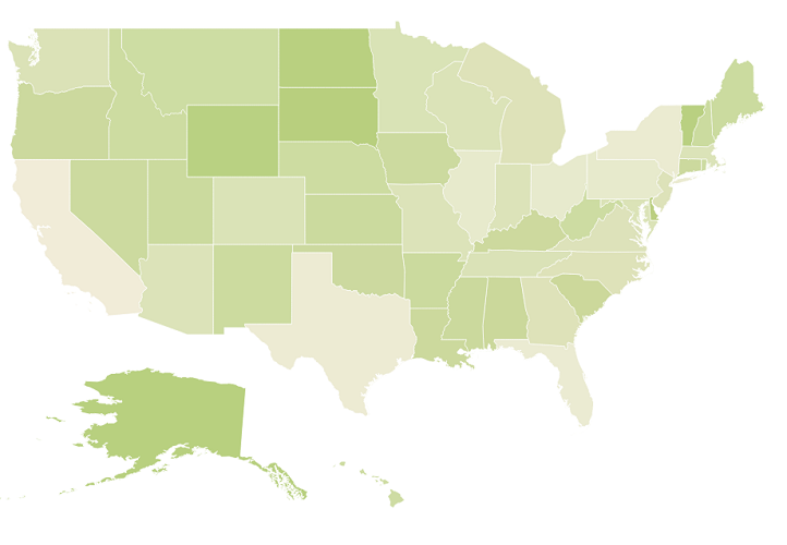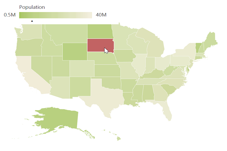 The Range color mapping is used to differentiate the shape’s fill based on its underlying value and color ranges. The from and to properties defines the value ranges and the gradientColors property defines the equivalent color ranges respective to their value ranges.