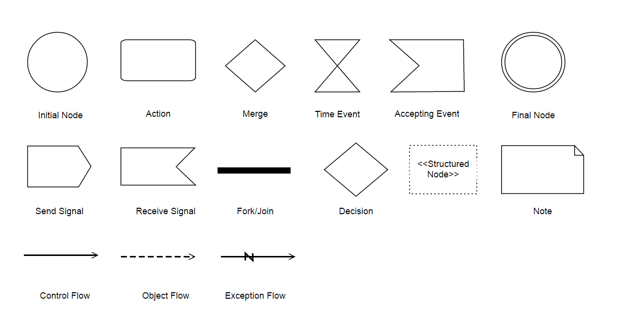 UML activity Shapes used to draw a behavior diagram which shows flow of control or object flow with emphasis on the sequence and conditions of the flow.