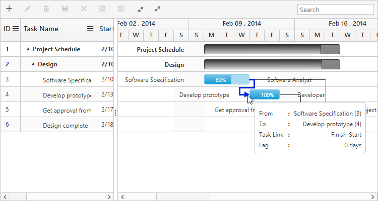 });Taskbar tooltip can be customized by using the taskbarTooltipTemplate property and dependency line tooltip can be customized by using the predecessorTooltipTemplate property, these properties are described briefly in the customization section.