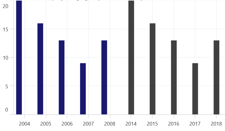 In DateTimeAxis, intervals can be customized by using the Interval and IntervalType properties. For example, setting Interval as 6 and IntervalType as Months will consider 6 months as interval.