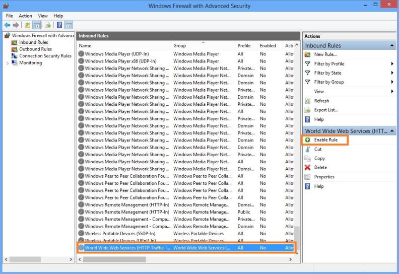 Select World Wide Web Services and click Enable Rule as shown in the above screenshot. This allows the HTTP traffic from outside the host.