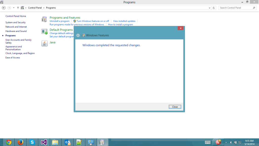 The Turn Windows features on or off dialog appears. Check all the features under Internet Information Services and Internet Information Services Hostable Web Core and click OK.