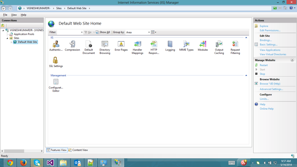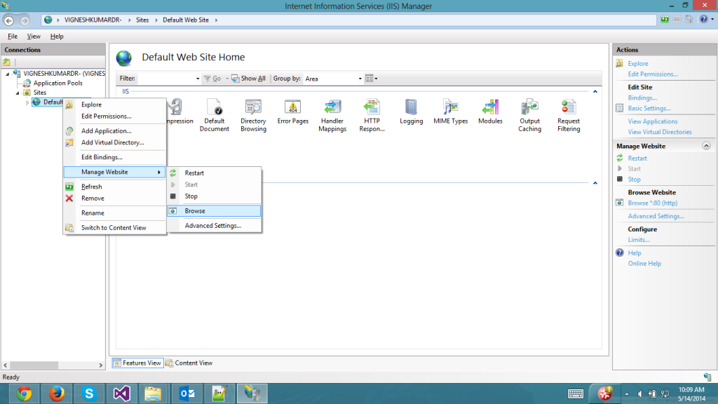 Right-click the Default Web Site and select Browse from the Manage Website.