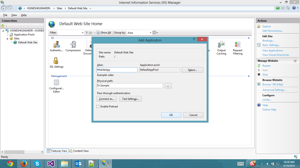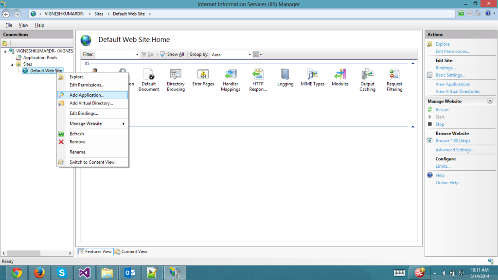 To Host an Application in the IIS, right click the “Default Web Site” and Select Add Application.