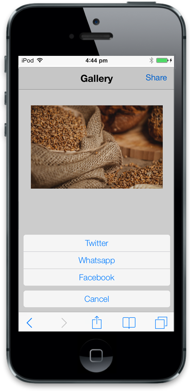 Essential JS Mobile Menu widget can be rendered from a hierarchy of <ul> and <li> and can perform unique actions based on the properties given for each <li> item. You can easily customize the Menu control by changing its properties. In the following code example, the gallery app menu is used to show multiple sharing options to share images.
