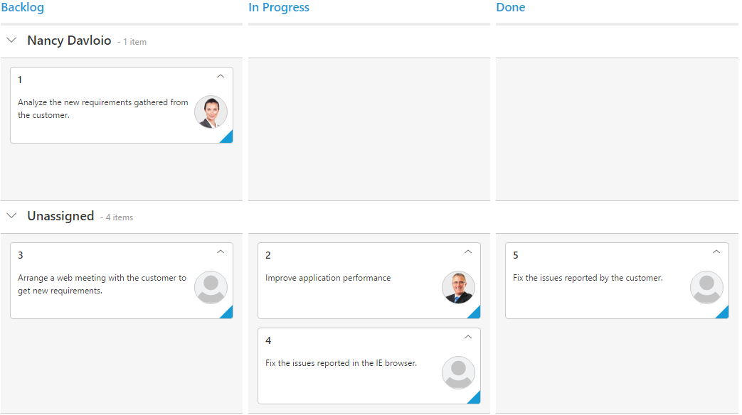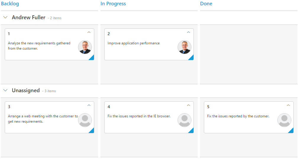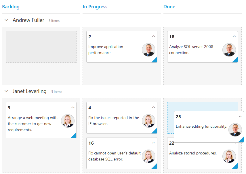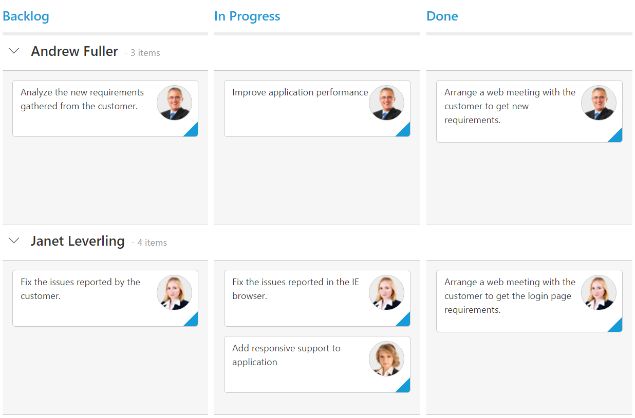 <div id='Kanban'></div>window.kanbanData = [{ Id: 1, Status: "Open", Summary: "Analyze the new requirements gathered from the customer.", Type: "Story", Priority: "Low", Tags: "Analyze, Customer", Estimate: 3.5, Assignee: "Andrew Fuller", ImgUrl: "../content/images/kanban/2.png", RankId: 1 }, { Id: 2, Status: "InProgress", Summary: "Improve application performance", Type: "Improvement", Priority: "Normal", Tags: "Improvement", Estimate: 6, Assignee: "Andrew Fuller", ImgUrl: "../content/images/kanban/2.png", RankId: 1 }, { Id: 3, Status: "Open", Summary: "Arrange a web meeting with the customer to get new requirements.", Type: "Others", Priority: "Critical", Tags: "Meeting", Estimate: 5.5, Assignee: undefined, RankId: 2 }, { Id: 4, Status: "InProgress", Summary: "Fix the issues reported in the IE browser.", Type: "Bug", Priority: "Release Breaker", Tags: "IE", Estimate: 2.5, Assignee: null, RankId: 2 }, { Id: 5, Status: "Close", Summary: "Fix the issues reported by the customer.", Type: "Bug", Priority: "Low", Tags: "Customer", Estimate: "3.5", Assignee: "", RankId: 1 }];