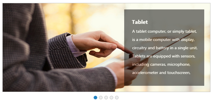 This feature allows you to add text along with the image in Rotator control. This is achieved by splitting the content into two panels. In the following code example, image is given in the left panel and text is given in the right panel.