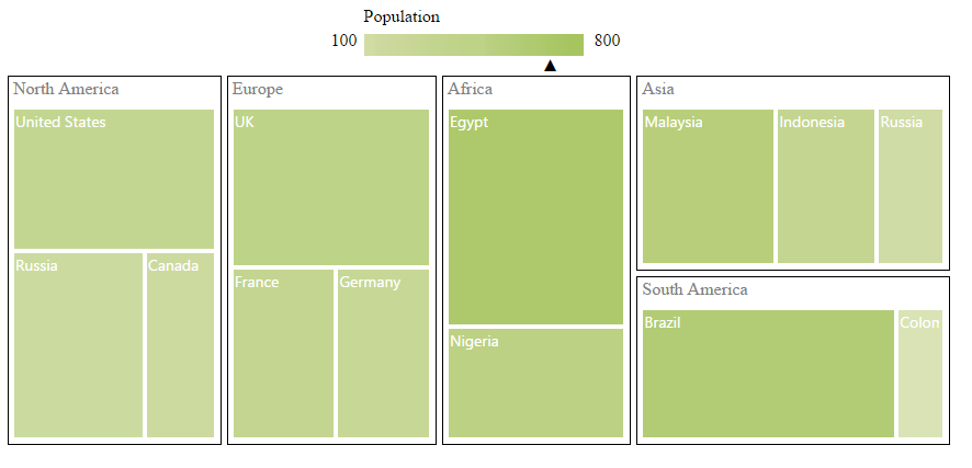 The legends can be made interactive with an arrow mark indicating the exact range color in the legend when the mouse hovers over the corresponding treemap items. You can enable this option by setting mode property in legend settings value as “interactive” and default value of mode property is “default” to enable the normal legend.