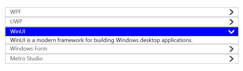 new AccordionItem { Name = "WinUI", Description = "WinUI is a modern framework for building Windows desktop applications." },