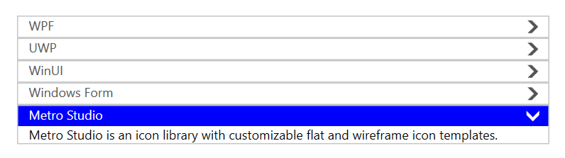 new AccordionItem { Name = "Metro Studio", Description = "Metro Studio is an icon library with customizable flat and wireframe icon templates." }