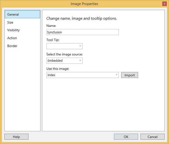 General - To set the Name,ToolTip of the image or image source, select an embedded image and import an image from the local disk.