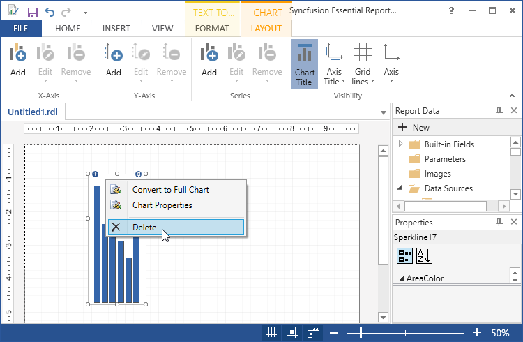 To Apply Styles to the sparkline, Right Click on the sparkline and select the Chart Properties from the context menu or click on the view report item properties.