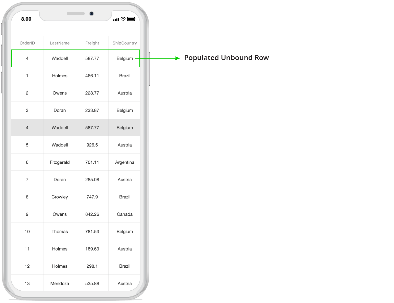 The Xamarin.iOS DataGrid allows you to add additional rows at top and also bottom of the DataGrid which are not bound with data object of underlying data source. You can add unbound rows using SfDataGrid.UnboundRows collection property. You can add any no of unbound rows to the DataGrid. Unbound rows can also be exported to pdf and excel documents.